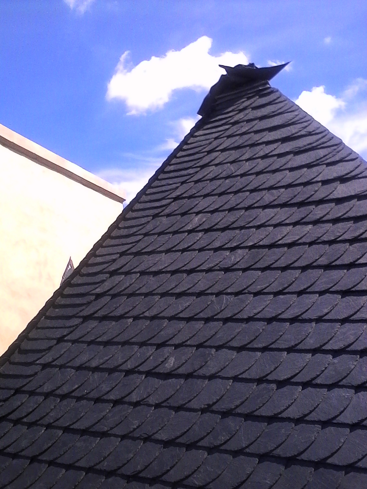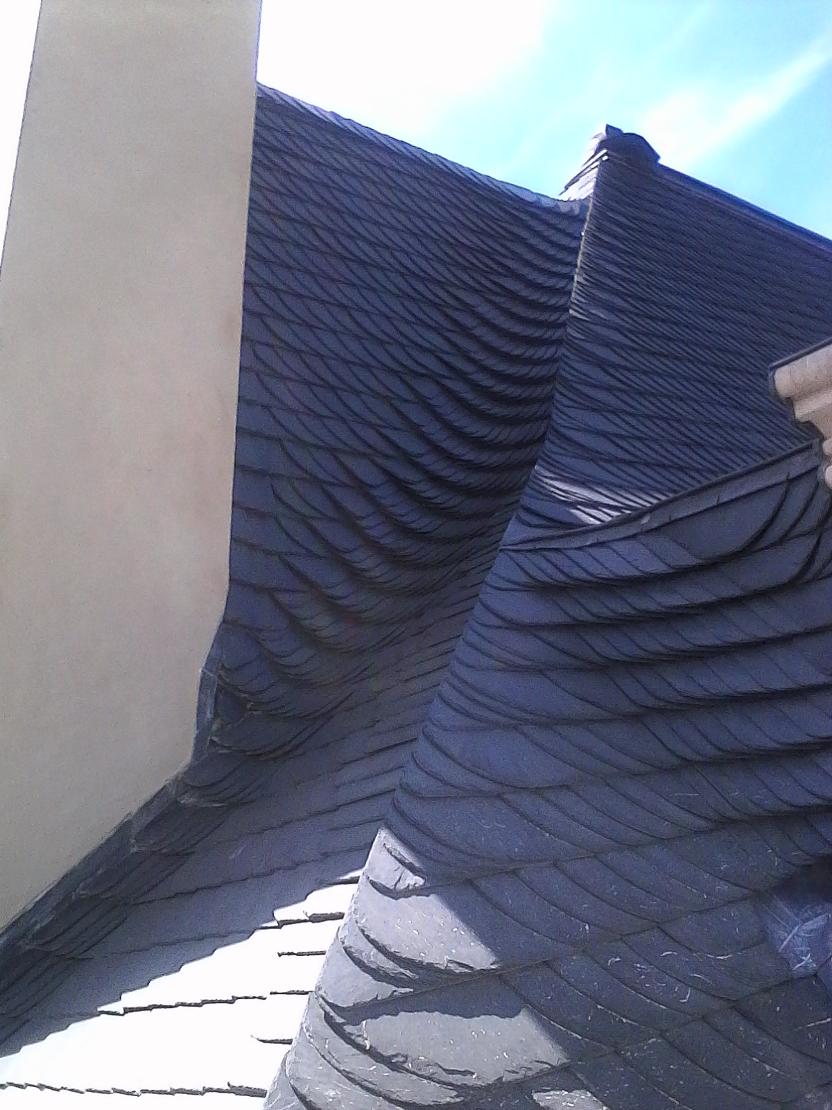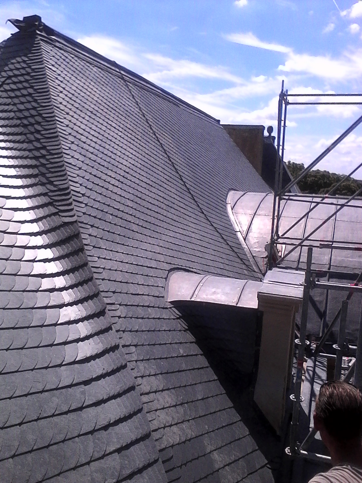 Sur ce chantier les nombreux angles et courbes rendent le placement et l’ajustement des ardoises difficile.
