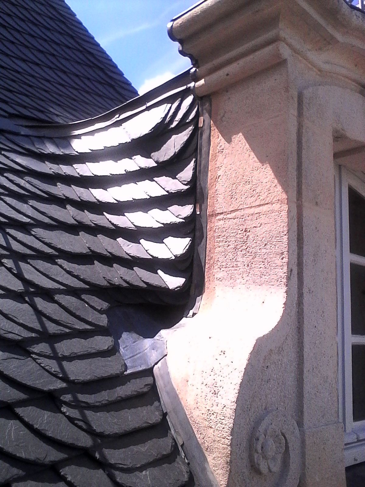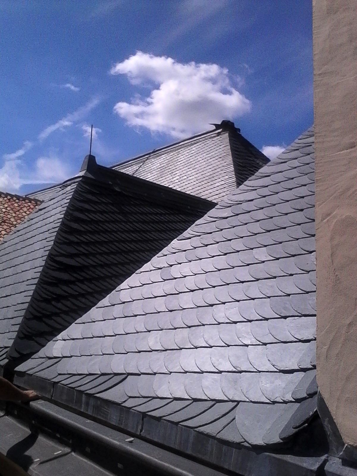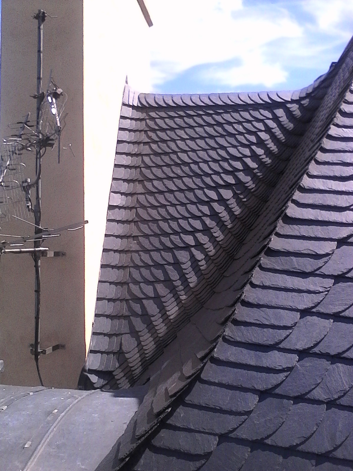 Sur ce chantier les nombreux angles et courbes rendent le placement et l’ajustement des ardoises difficile.